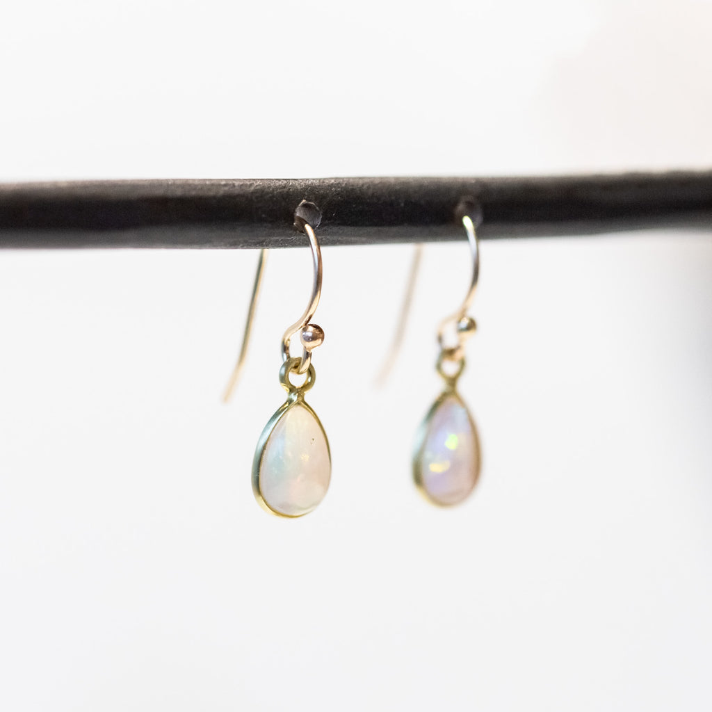 Small cabochon teardrop opal earrings bezel set in 18k yellow gold