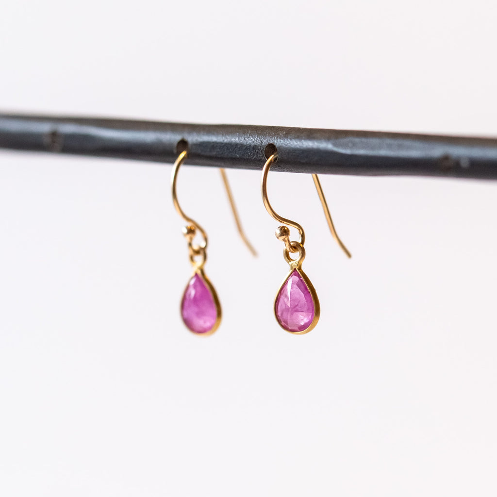 Small faceted teardrop ruby drop earrings bezel set in 14k yellow gold