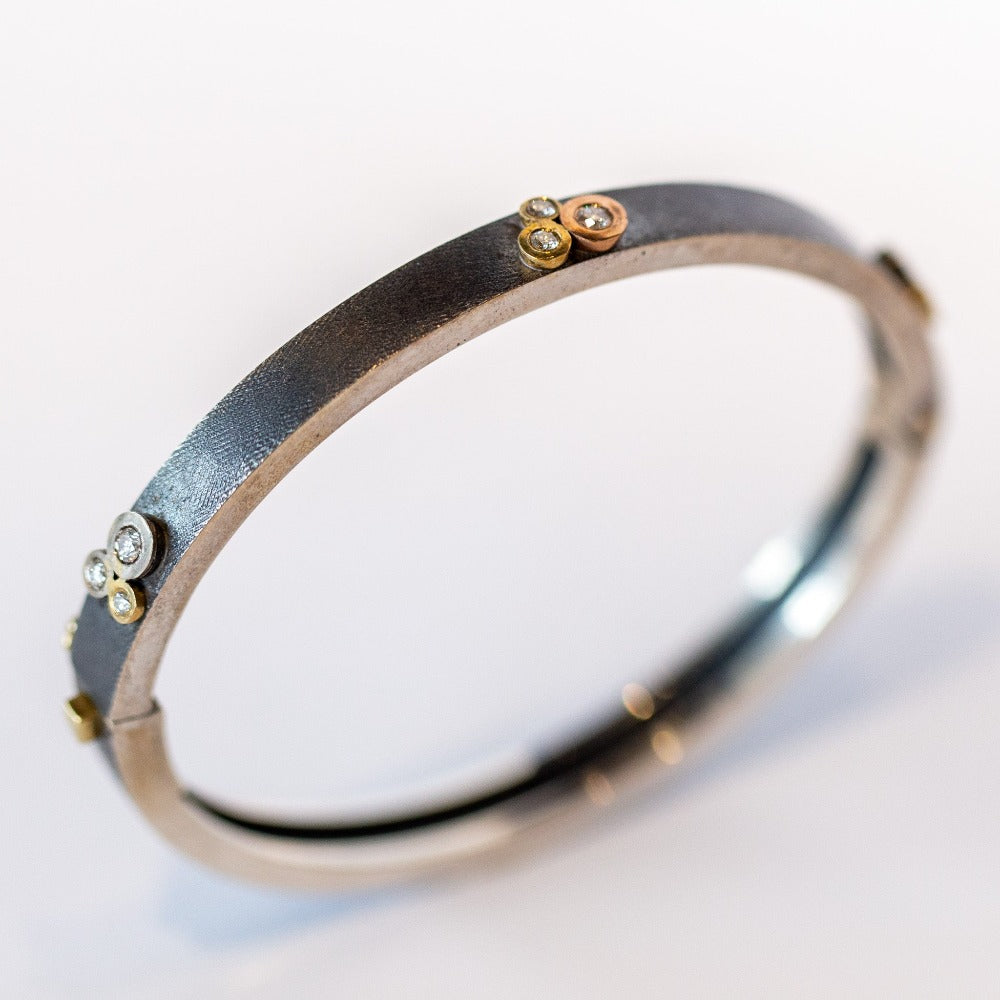 Sterling silver with diamond clusters set in 18k rose and yellow gold bezels