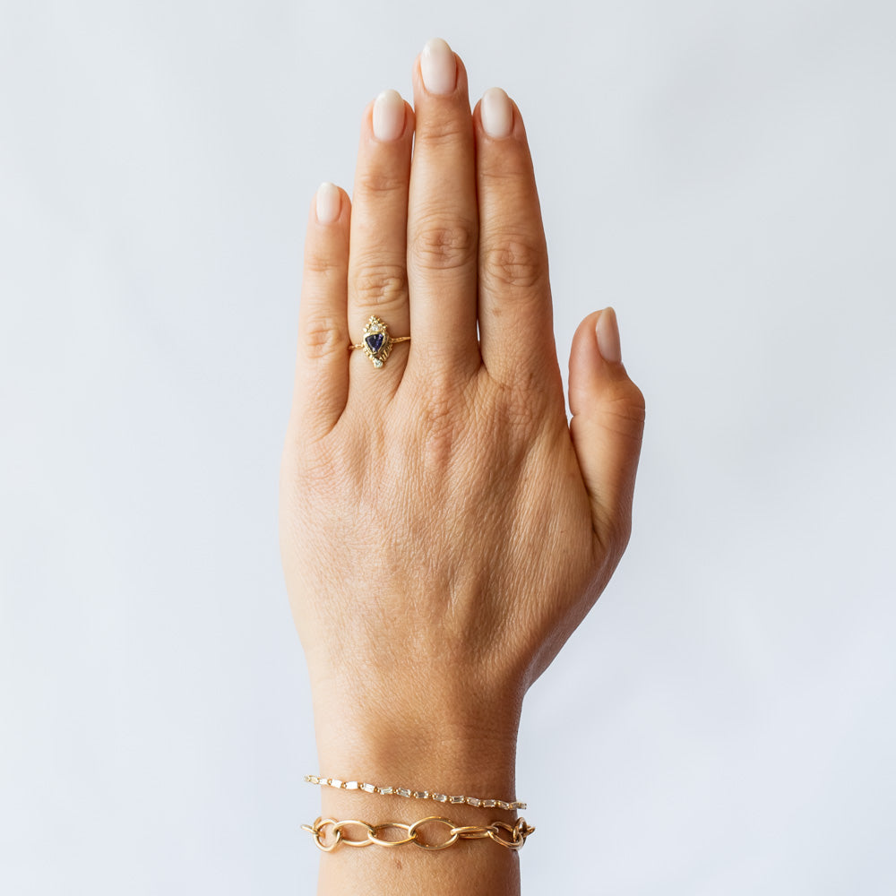 Delicate strength embodied in a single piece of jewelry, this Spirit Warrior ring from Communion by Joy helps you remember that you are always guided and protected by the light of your inner spirit. It features a stunning, rich bluish-purple, trillion cut iolite gemstone — a gem said to strengthen intuition, encourage calm, and release stress — flanked by sparkling white diamonds. The stones are all set in a an intricately hand carved 14 karat yellow gold ring with a delicate band.