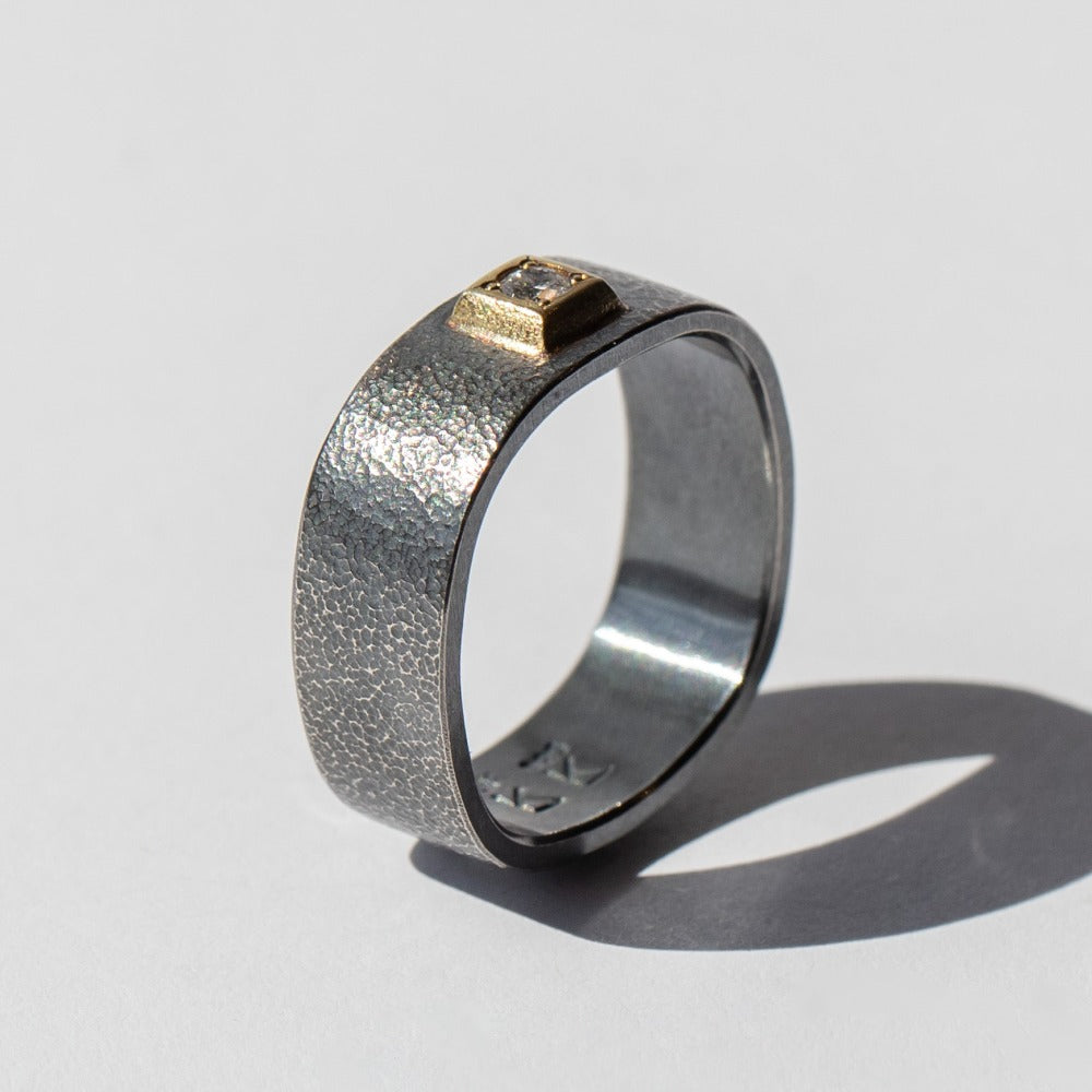 Textured oxidized sterling silver band with single flush white diamond set in 18k yellow gold