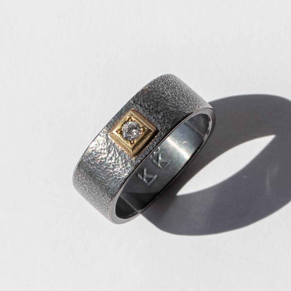 At the heart of the ring lies a striking 18 karat gold square set with a single brilliant diamond, which creates a stunning contrast against the textured silver band. It's a unique wide band perfect for both men or women that works well as both a wedding band and an everyday jewel you can treasure forever.