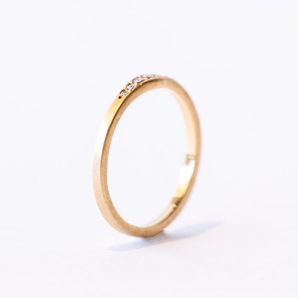 This beautiful and modern addition to our collection would be equally at home in a ring stack or as a wedding band. A delicate taper in shape and diamond size make you want to lean in and see all the details on this one.