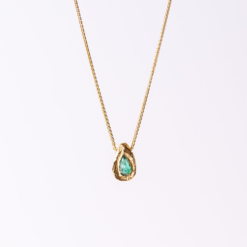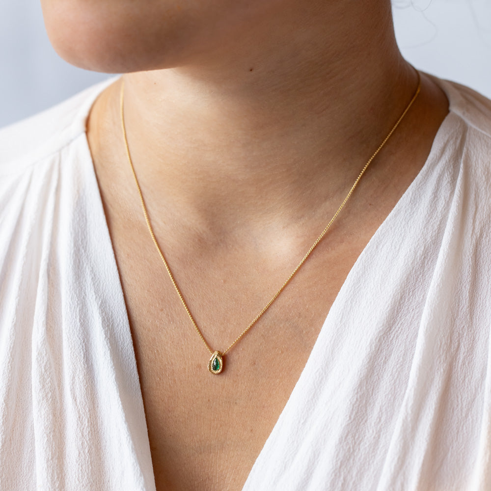 Perfect for a May birthstone gift, or a treat for yourself, this emerald necklace from designer Page Sargisson is a crowd favorite. It features a vibrant teardrop shaped emerald set into a wide bezel featuring the designer's signature hand carved texture. The petite pendant slides along a classic gold chain. Makes a sweet little pop of color on its own, or pair it with other necklaces in your jewelry collection for a layered look.