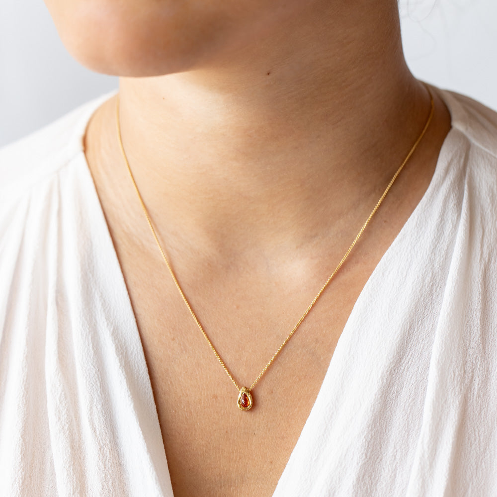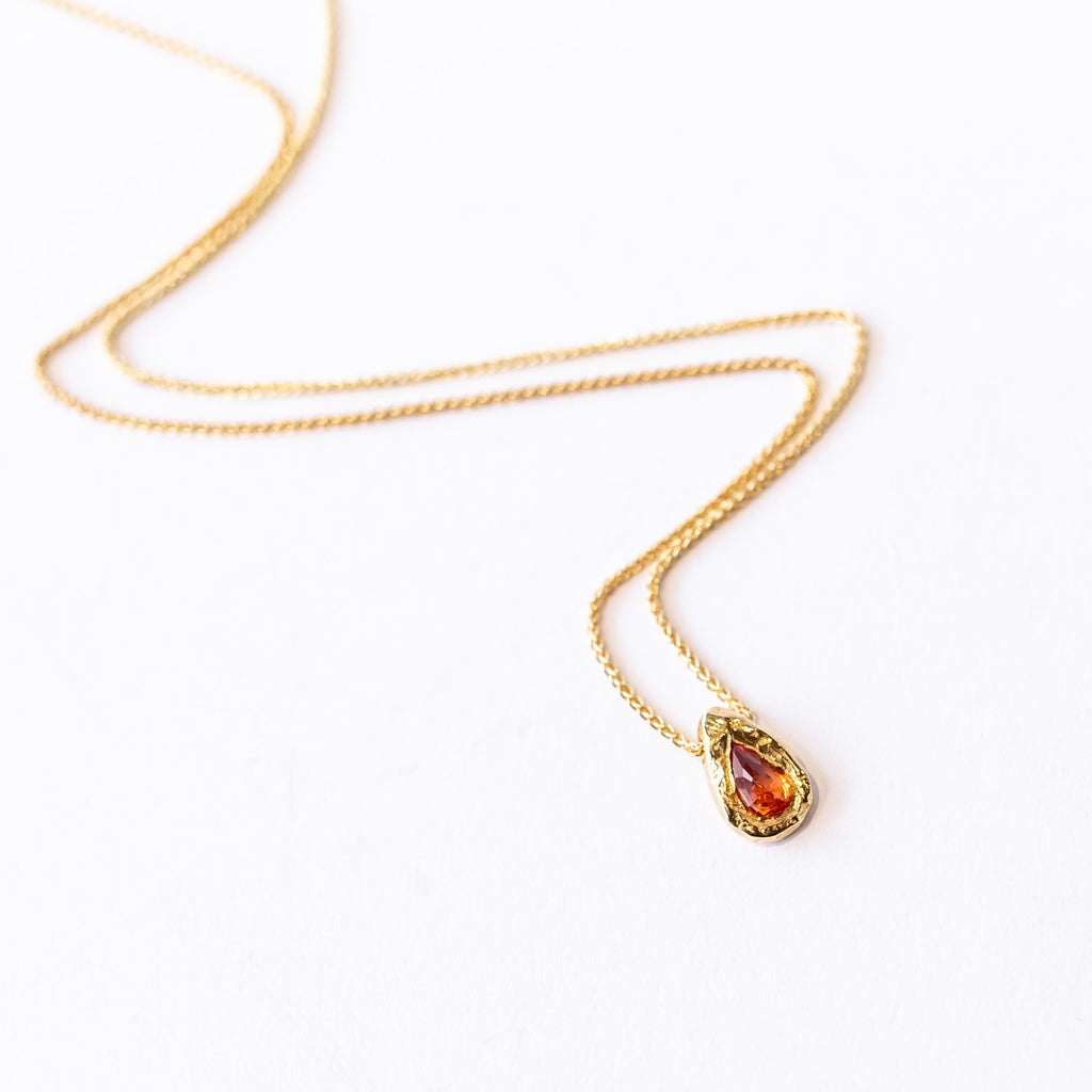 Need some warmth and color in your jewelry collection? Try this sophisticated gemstone pendant from designer Page Sargisson. It features a dainty teardrop shaped red-orange sapphire set into a bezel drop featuring the designer's signature hand-carved texture. The pendant slides along a classic gold chain necklace. Wear it alone for an everyday statement or pair it with other necklaces in your collection for a layered look.