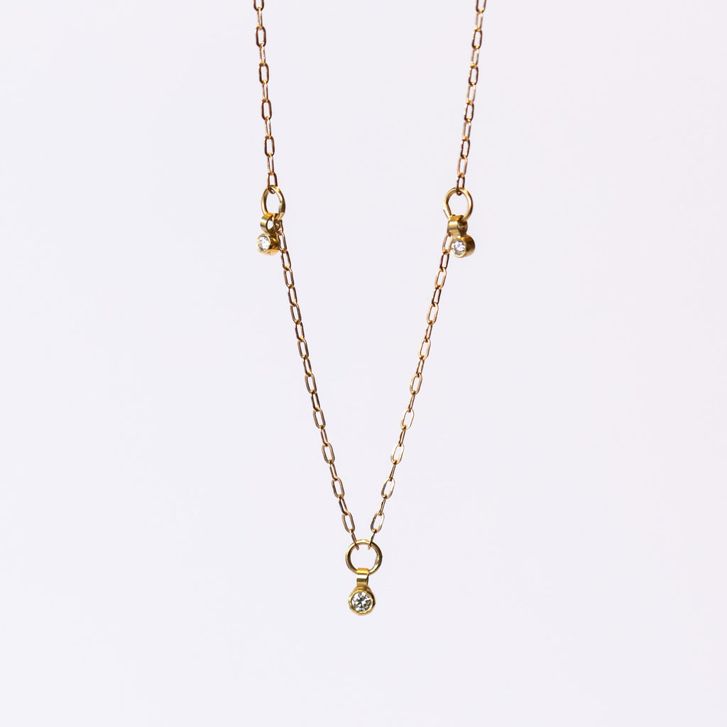 Three tiny white diamonds bezel-set in 18k gold at distinct stations on 14k gold chain.