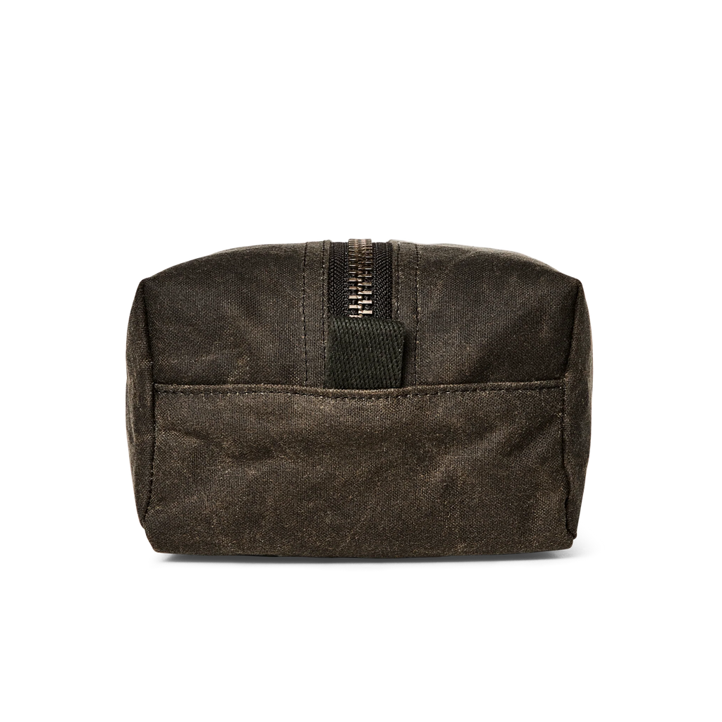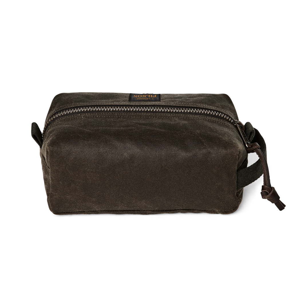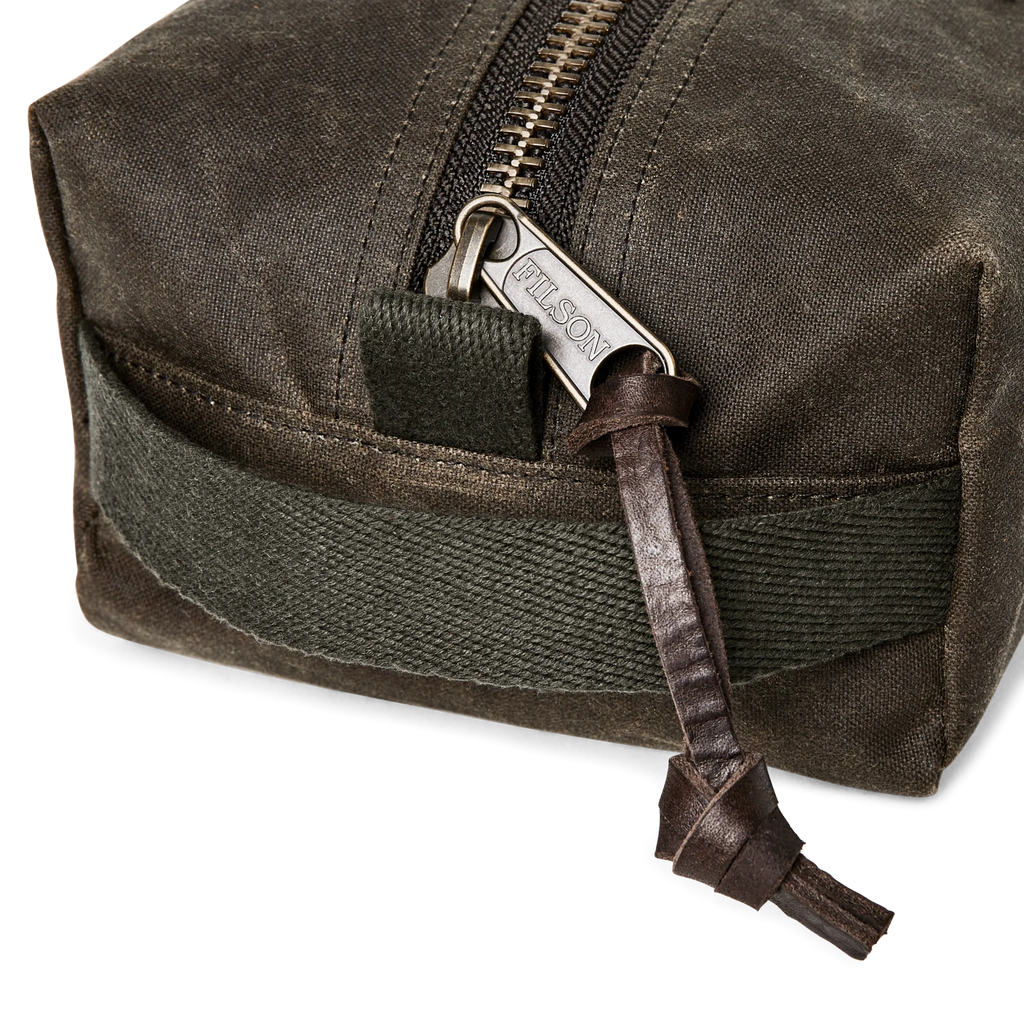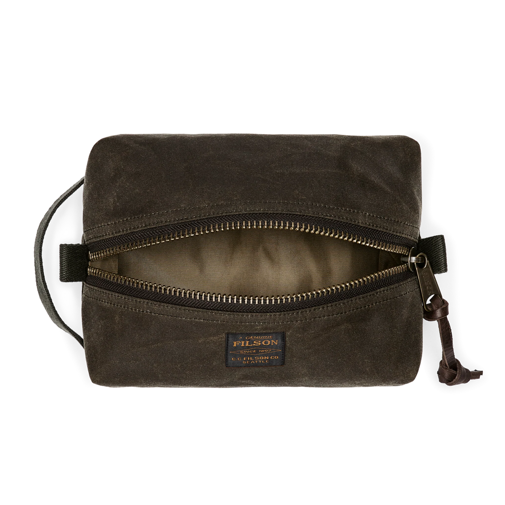 Filson's Tin Cloth Travel Kit is a lighter-weight dopp kit that carries travel essentials for a lifetime of journeys. It's made with their iconic waxed canvas that's protected foresters, sportsmen, and tradesmen from harsh weather, brush, and abrasion for more than a century. It's fully lined with nylon to protect contents, and secures with a heavy-gauge metal YKK® zipper. The cotton-webbing grab handle doubles as a loop for hanging. Bridle Leather zipper pull.