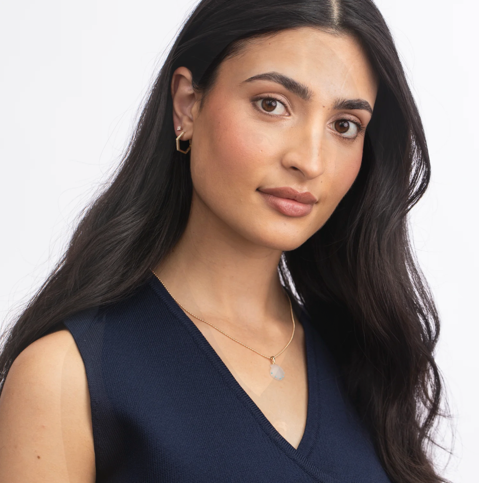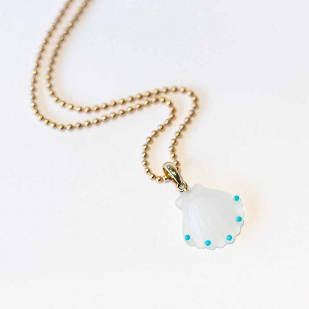 Head to the coastline with Ariel Gordon's Turquoise and Quartz Scallop Shell Pendant. It'll help you keep that sweet summer vibe going all year long with the hand carved matte quartz shell with little turquoise cabochon accents. Strung on a 16-inch gold bead chain for a bit of extra sparkle.