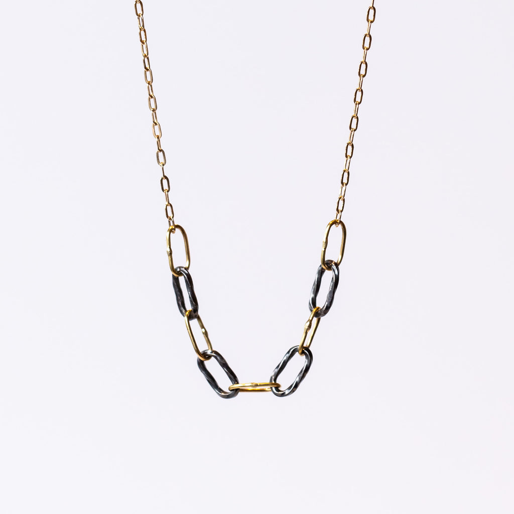 Mixed paperclip chain in 18k yellow gold, 14k yellow gold, and oxidized sterling silver