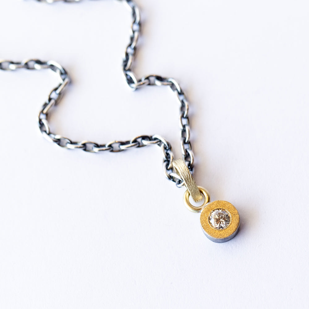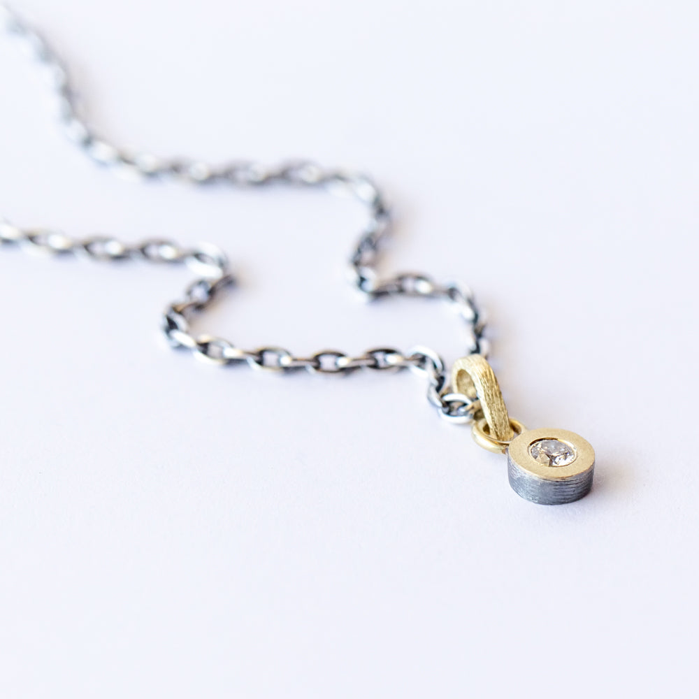Set in the center of the pendant is a single 0.30ct round white diamond, giving this piece just the right amount of luxe sparkle. The oxidized sterling silver chain (18" long) adds an unexpected twist, making this diamond pendant a go-to for days when you want to keep things simple but still turn heads.