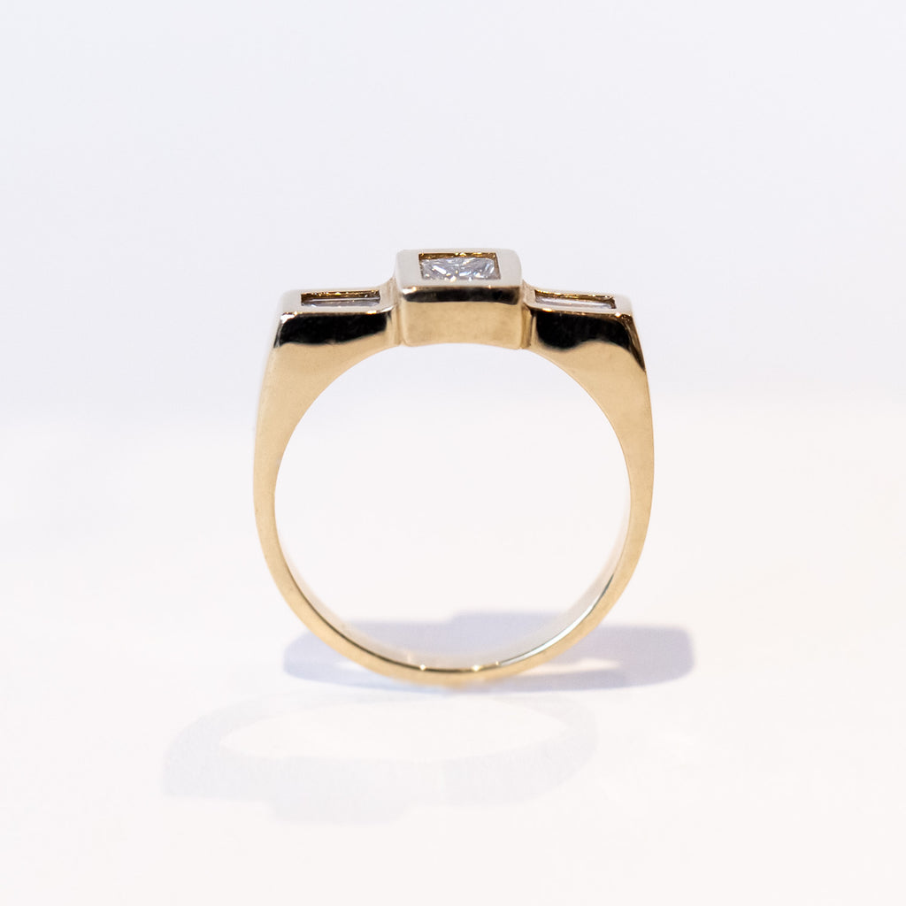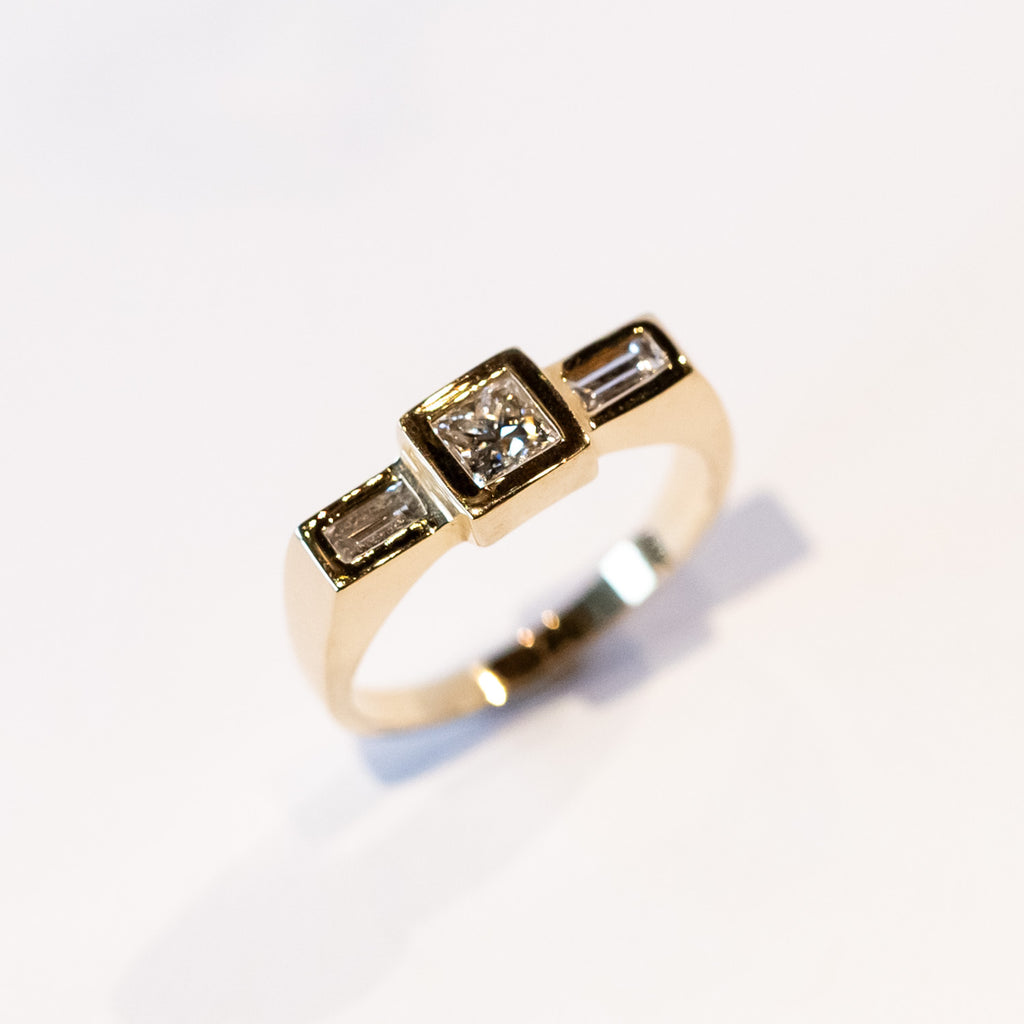 0.63tcw princess and baguette cut diamonds bezel set into 14k yellow gold