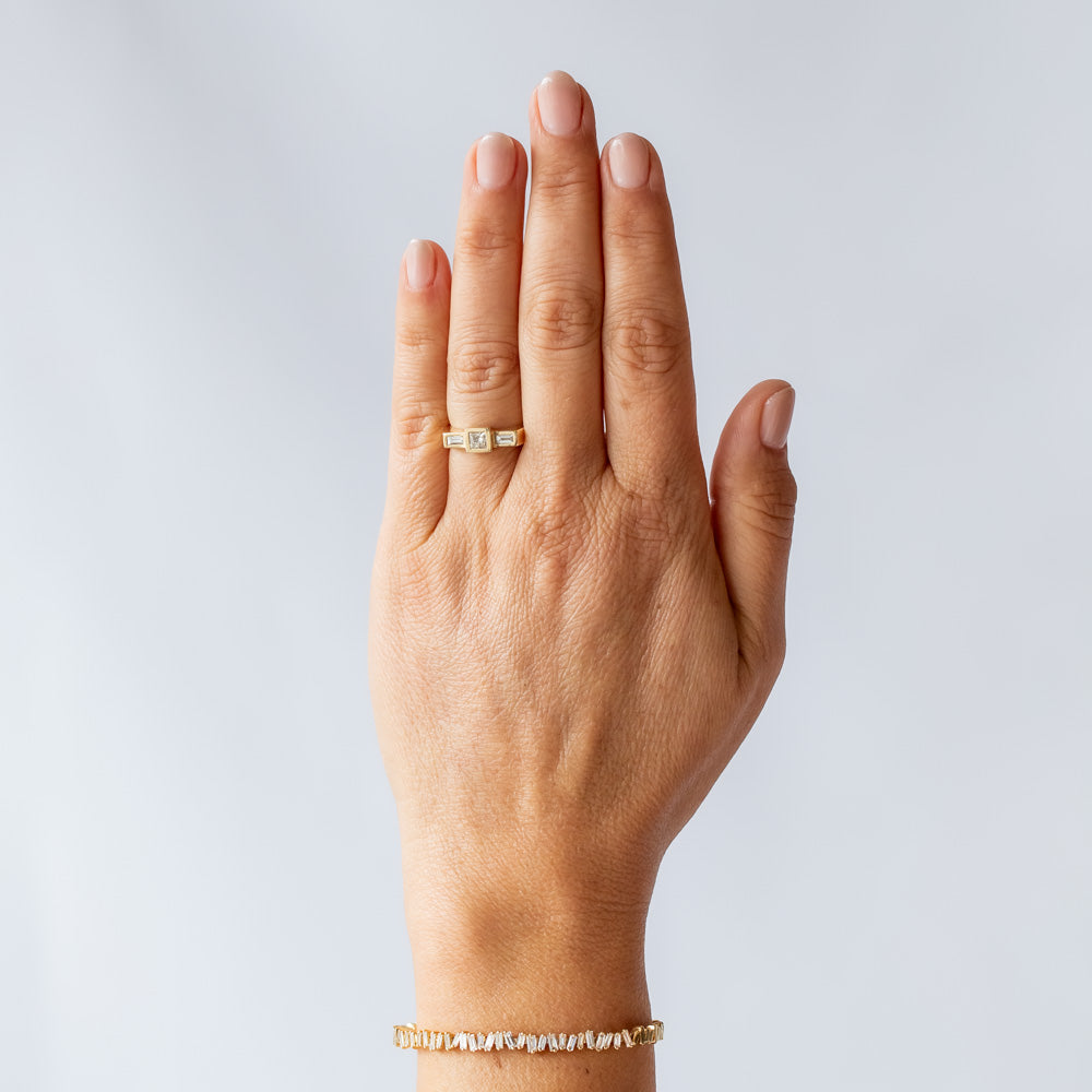 Meet Adeline's modern three-stone diamond ring—a cool-girl take on classic glam. With a sleek, horizontal signet vibe, this three-stone stunner features a square princess-cut diamond in the center, flanked by sharp horizontal baguettes for that extra edge. The chunky 14k yellow gold bezel setting gives it a geometric, sculptural feel that says, “I’m here, and I’m fabulous.” White diamonds symbolize clarity and new beginnings, making this piece perfect for fresh starts (like popping the question)—or just leveling up your ring game. Whether you’re stacking it or letting it steal the show solo, this ring is pure golden-hour magic. She makes a beautiful, modern engagement ring as well.