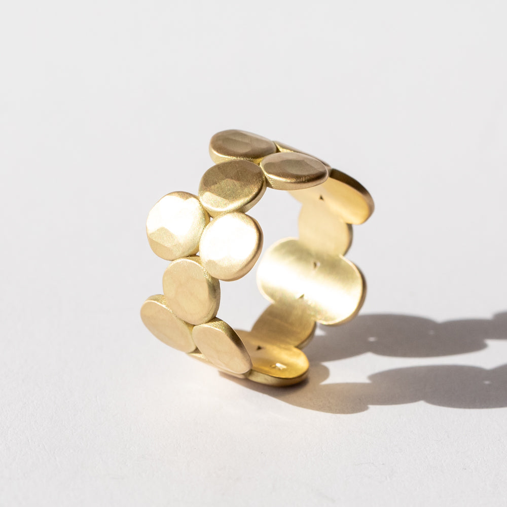 Bold, textured, and effortlessly cool, this wide gold band is the ultimate statement piece. Crafted in rich 18k yellow gold, its design features rows of hammered gold dots, creating a dynamic, light-catching surface that feels both modern and timeless. With its substantial width and luxe weight, this ring gives serious power-ring energy—perfect for making your everyday look a little more golden. Whether you're drawn to its artisanal texture or love the boldness of a women's cigar band, this hammered gold ring is a standout in wide gold bands and a must-have for any jewelry collection.